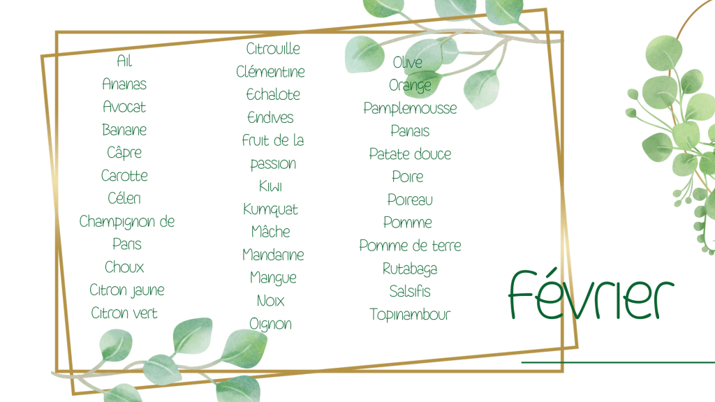 Nous allons vous présenter juste ici un calendrier des fruits et légumes de saisons en fonction du mois ! Ainsi, vous saurez en avance ce qui se trouvera dans le rayon fruits et légumes de votre magasin en ce mois de février.