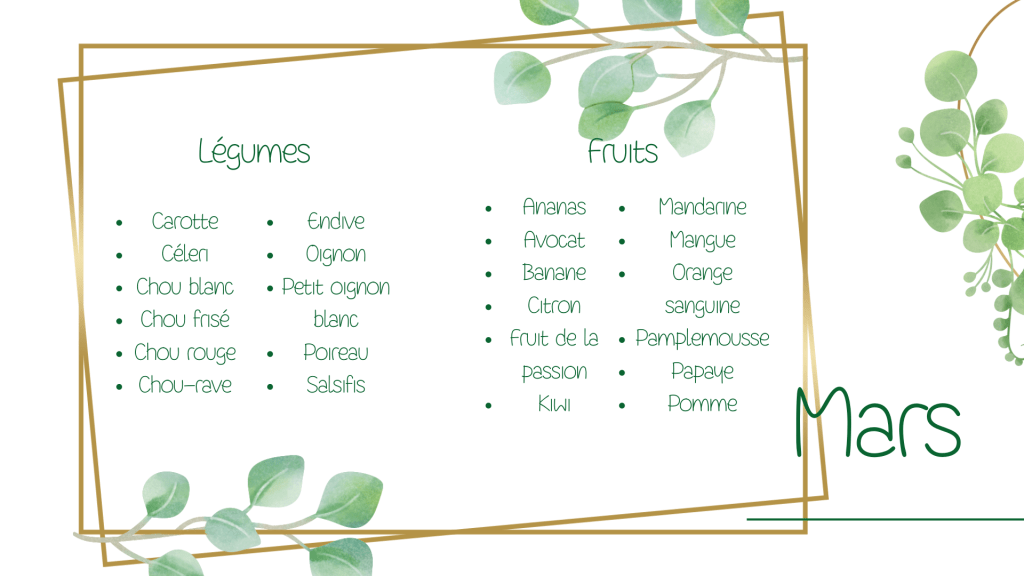 Nous allons vous présenter juste ici un calendrier des fruits et légumes de saisons en fonction du mois ! Ainsi, vous saurez en avance ce qui se trouvera dans le rayon fruits et légumes de votre magasin en ce mois de mars.